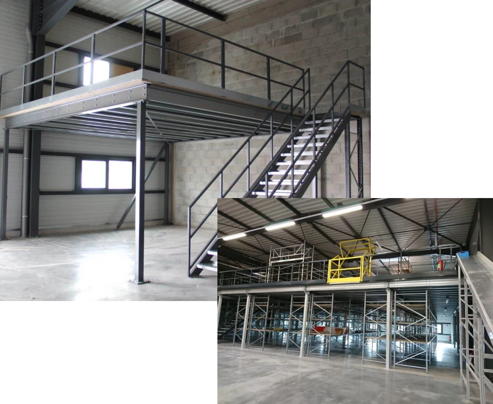 - Plateforme mezzanine : création d’un étage de stockage ou d’un espace de travail